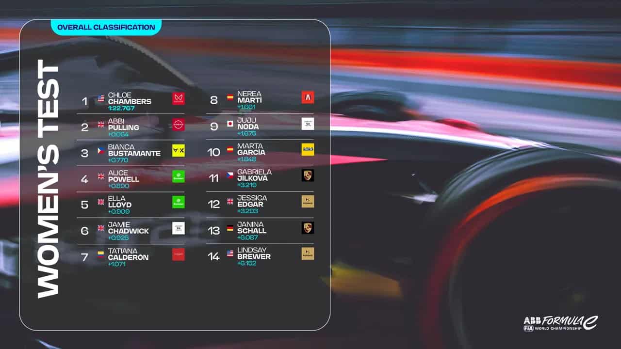 3時間ずつの2セッションにわたり、14名の才能あふれる女性ドライバーたちが走行を行い、その中でマヒンドラ・レーシングのクロエ・チェンバースが最速タイムを記録した。
